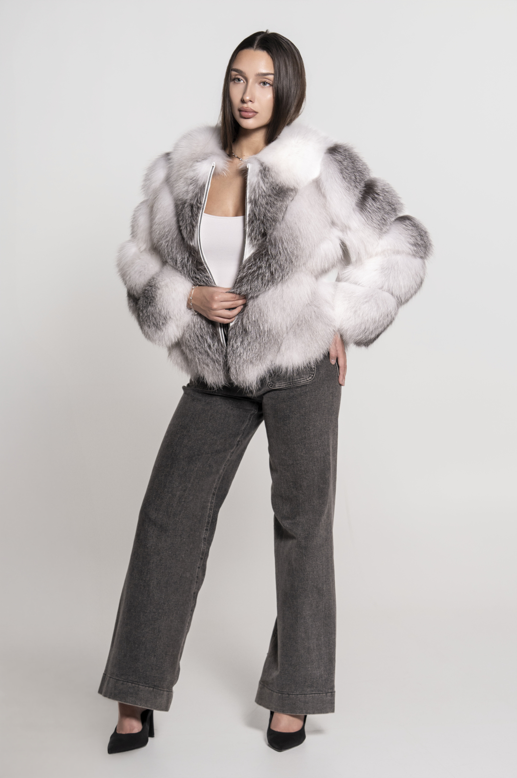O piesă de lux care îmbină eleganța clasică cu funcționalitatea modernă — haina din blană naturală de vulpe arctică, model 2 în 1, este alegerea perfectă pentru femeia rafinată și sofisticată. Realizată manual din blană naturală de cea mai înaltă calitate, această haină impresionează prin textura sa bogată, nuanțele delicate de alb cu reflexe argintii și luciul natural specific vulpii arctice.