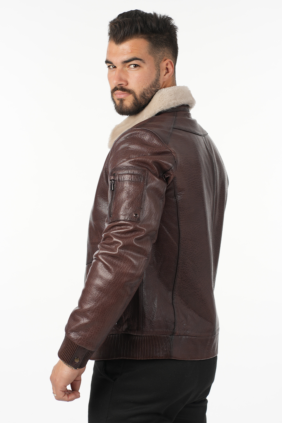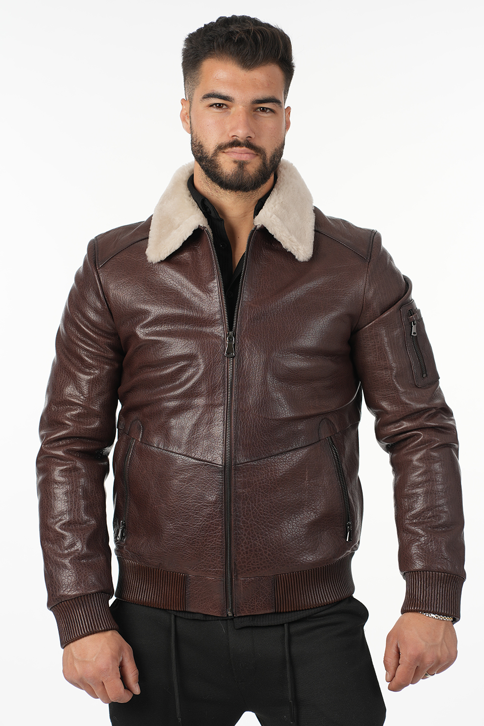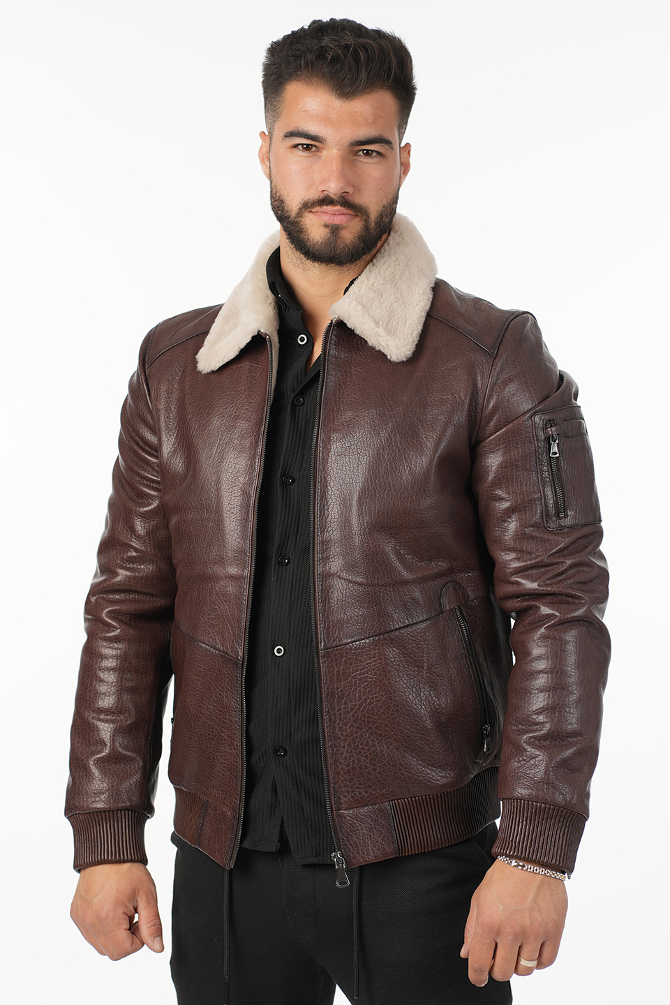 Confecționată din piele naturală 100% de vită, cu o textură durabilă și aspect masculin, jacheta este accesorizată cu blană naturală din miel toscan, inclusiv un guler călduros din aceeași blană fină și luxoasă.