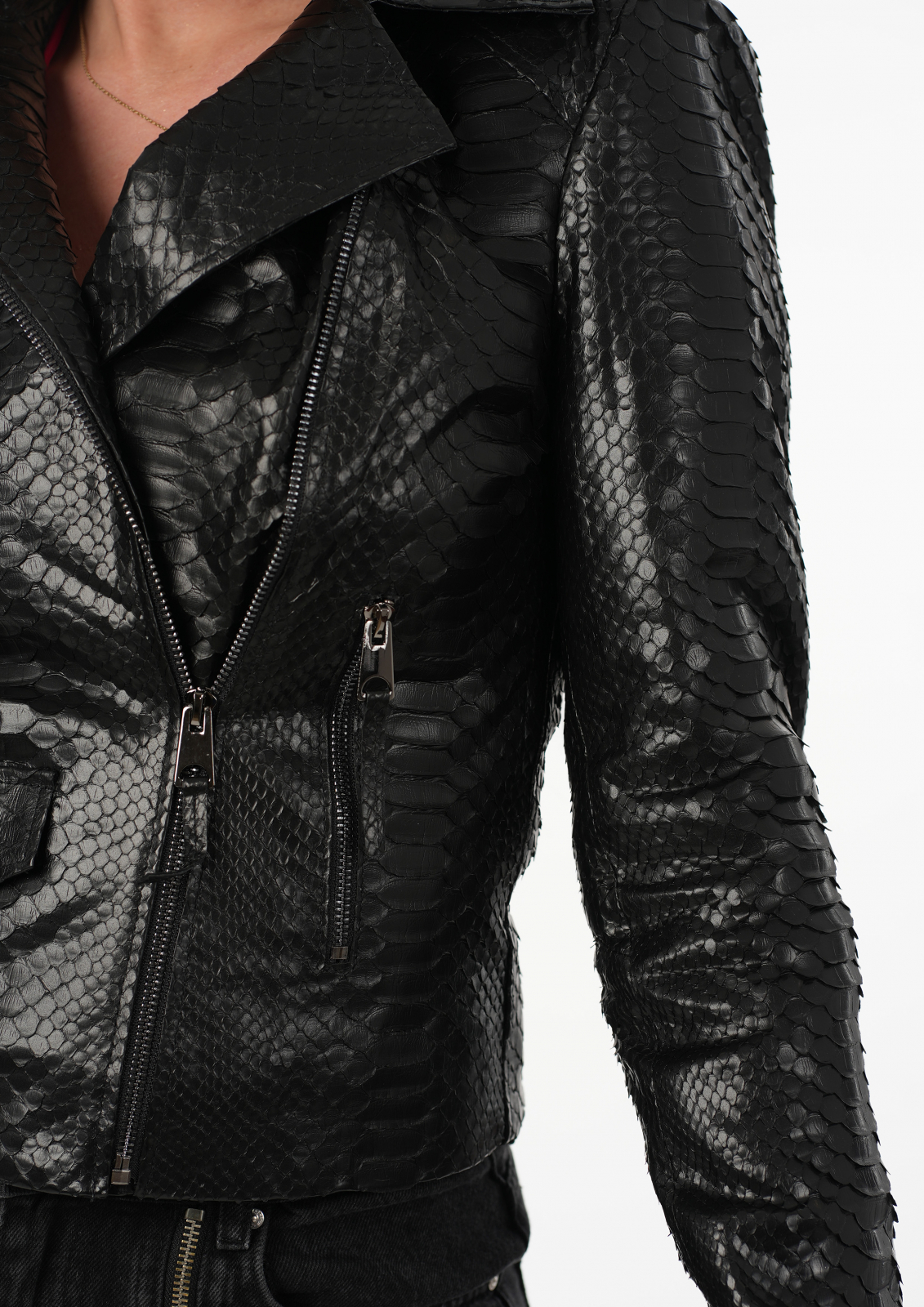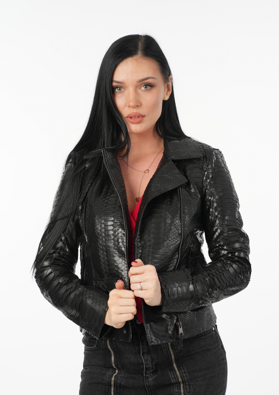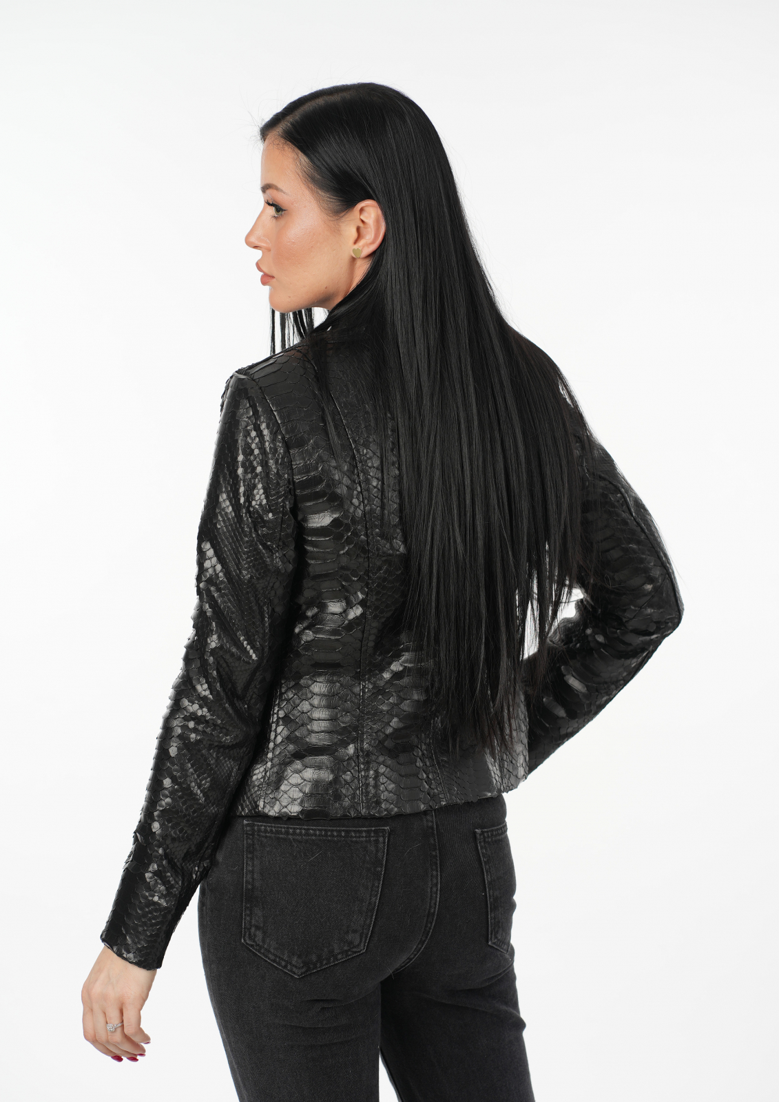 Geacă din piele naturală de piton 100%, cu fermoar metalic și 2 buzunare laterale cu fermoar metalic. Design de lux, ideal pentru un look sofisticat.
